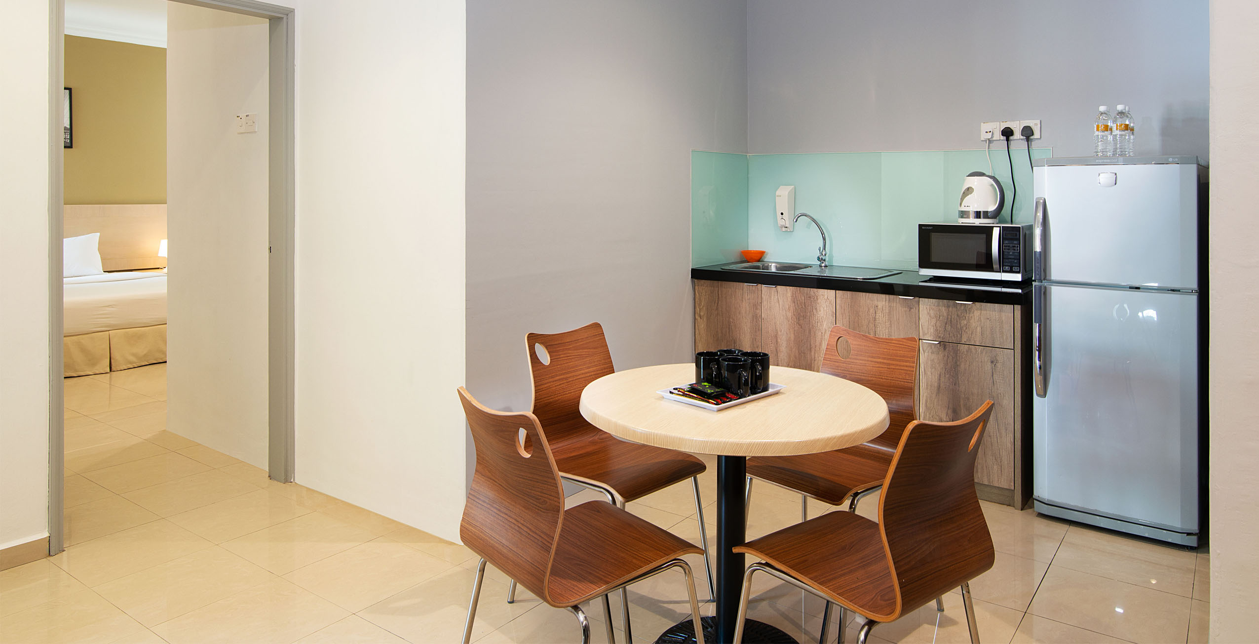- Dapur kecil dilengkapi dengan meja makan beserta kursi makan, kulkas, microwave, teko untuk membuat teh dan kopi, peralatan makan dan perkakas dapur.